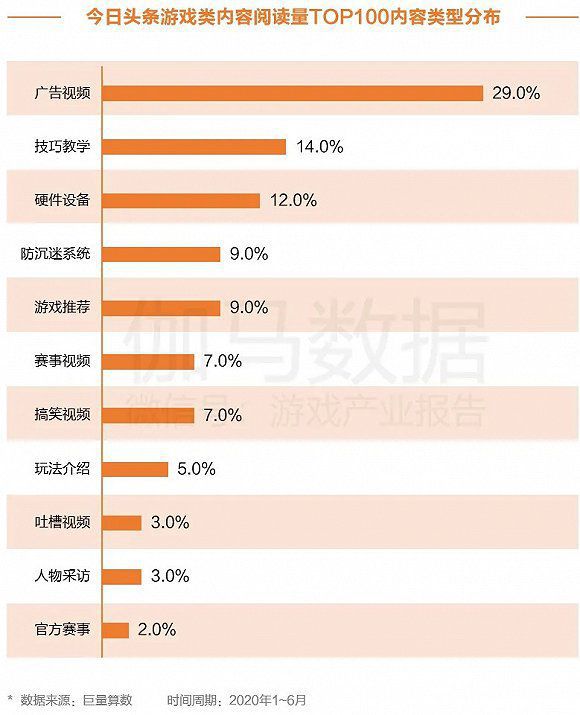在如今日头条等的信息流媒体中,其游戏类相关内容阅读量TOP100中,数量占比最多的仍是广告类的推广视频,占比29.0%。但相较于其他平台,信息流媒体包含的内容更加广泛,除广告视频外,还有如游戏笔记本电脑推广等游戏相关硬件设备、未成年人防沉迷系统建设情况等文章。