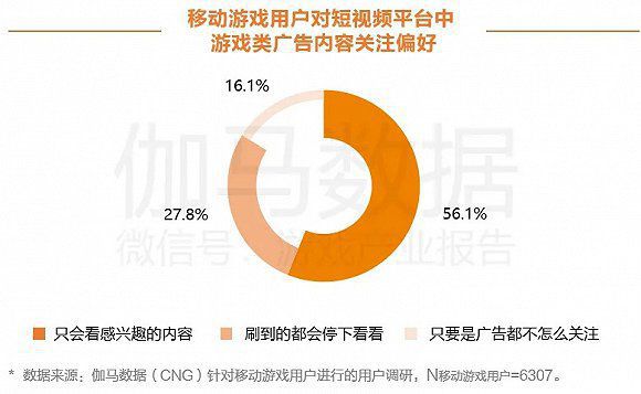 伽马数据用户调查显示,移动游戏用户中,56.1%的用户只会看感兴趣的游戏类广告,27.8%的用户刷到就会停下看看。