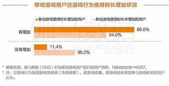 根据伽马数据对移动游戏用户进行的用户调查,在移动游戏使用时长增加的用户中,泛游戏行为时长增加的情况也更为普遍,占比近九成。
