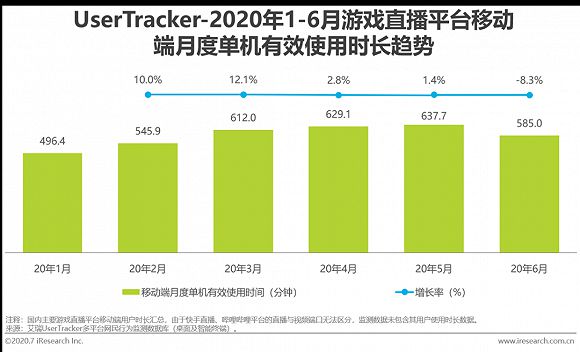 疫情期间,全球用户的互联网在线时长均有所提升,而游戏直播成为用户重要的在线娱乐方式。国外的Facebook在疫情期间提前推出游戏直播应用FacebookGaming,而国内的游戏直播平台也趁势发展。根据艾瑞数据监测产品UserTracker的数据显示,游戏直播移动端独立设备数在1-3月份有所增长,随着国内疫情好转后回落至平稳状态;但在用户时长上,4-6月份,移动端单机有效使用时间仍保持增长,疫情期间加强的用户直播观看习惯仍在继续生效,用户粘性显著提升。