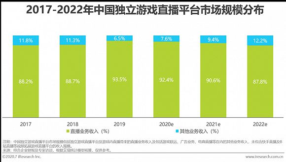 2019年直播业务收入仍是中国独立游戏直播平台最重要的收入来源,占整体收入的93.5%。随着各平台云游戏、直播带货等新型业务在2020年的起步与快速发展,游戏直播平台的收入来源将愈加多元化,直播业务的收入占比会逐渐下降。
