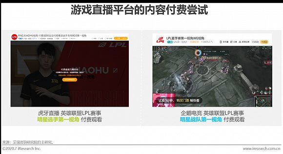在国内游戏直播行业发展之初,“百播大战”使得免费观看成为游戏直播平台争夺用户流量的唯一方式。随着游戏直播行业竞争格局的逐渐确立以及电竞赛事内容质量的不断提升,优质内容成为游戏直播平台打开用户付费大门的敲门砖。在英雄联盟S9期间,斗鱼推出付费观看内容;而在20年英雄联盟LPL赛事中,虎牙和企鹅电竞均推出了第一视角付费观看内容。如视频平台推出的超前点播模式,游戏直播平台以优质内容(头部赛事和差异化模式)和可接受价格(目前各平台主要为3元人民币/次),逐渐培养直播用户的内容付费习惯。