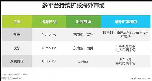 从虎牙和斗鱼2019年财报显示的营收情况来看,虎牙Q1至Q4的直播收入占比分别为95.2%,95.6%,95.2%,95.1%,全年占比为95.3%;而斗鱼为90.9%,91.2%,89.4%,91.7%,全年占比为90.8%。面对营收结构过于单一的情况,直播平台不断探索创新,发展出陪玩、直播电商、云游戏等新业务模式。同时,头部游戏直播平台继2018年出海东南亚市场之后,在2019年进一步扩张海外业务版图:虎牙进入巴西市场,而斗鱼上线新产品布局日本市场。