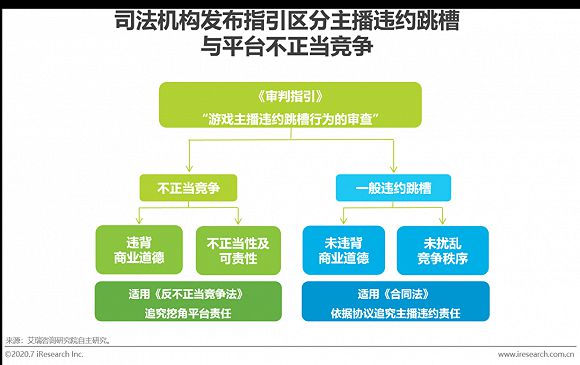 游戏直播行业在快速发展的过程中,各平台之间存在着主播违约跳槽及不正当竞争的情况,司法界通过法规指引及实际案例判决引导行业竞争乱象。一方面,广东高院2020年4月发布《关于网络游戏知识产权民事纠纷案件的审判指引(试行)》(简称审判指引)厘清主播违约跳槽和平台不正当竞争的界限;另一方面,违约案件高额赔偿的判决及司法界的审判意见,也使得主播挖角难以成为游戏直播平台竞争的关键点,未来平台间的主播竞争将不断趋于理性化。