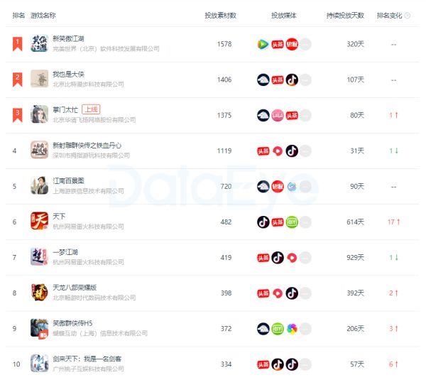 根据DataEye-ADX平台数据显示,武侠题材游戏买量产品榜中,持续投放天数超300天的游戏占4席,除了经典IP游戏《一梦江湖》、《天龙八部荣耀版》等,也不乏《掌门太忙》、《江南百景图》这类新兴产品。