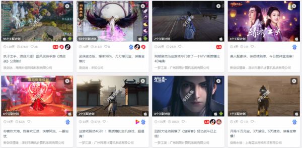 除此之外,受仙侠游戏爆款创意“巨鲲”影响,武侠游戏中也不乏“鲲”类创意素材。而真人出镜类,则以马天宇、林更新、赵丽颖等经常以古装形象出镜的明星为主。