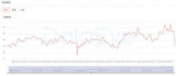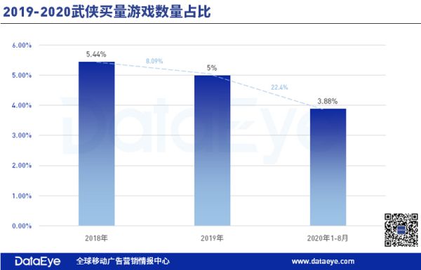 DataEye-ADX数据显示,武侠买量游戏数量在整个手游买量市场上的占比逐年降低,从2018年的占比5.44%,到2019年的5%,降幅8.09%,到2020年8月,更是下滑22.4%,缩减至3.88%。而在买量游戏题材的排名上,也被二次元游戏超越,排名下滑1位至第7。