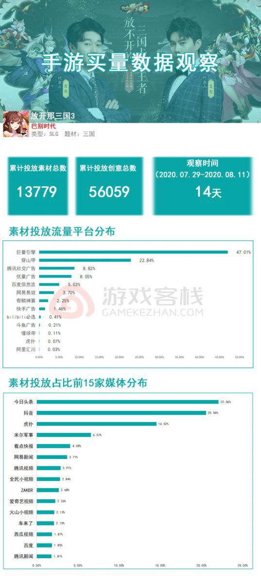 下图为2020.07.29至2020.08.11期间,《放开那三国3》手游在媒体、流量平台投放占比概况,以及广告素材数与创意组数等多个数据维度观察。从以下图表显示:《放开那三国3》手游投放的流量平台,巨量引擎占比最高为47.01%;其次穿山甲22.84%。素材投放占比前15家媒体平台,今日头条占比最高为22.06抖音20.54%,根据七麦数据显示,该游戏iOS平台近一周的下载量预估为113419。