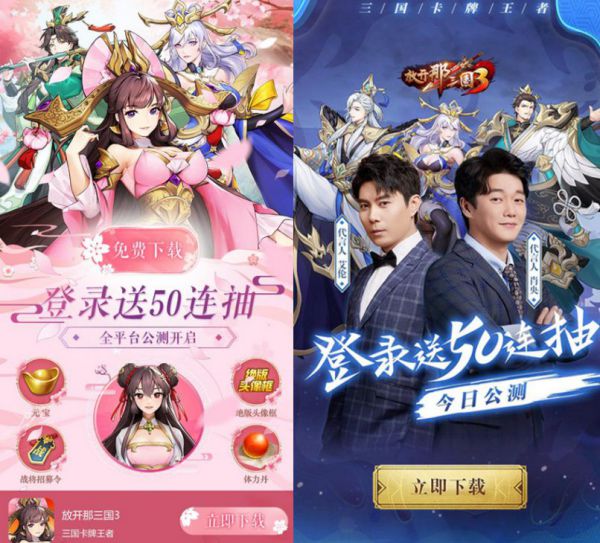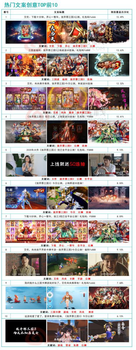 《放开那三国3》虽然有邀请肖央与艾伦作为代言人进行游戏宣传,但在广告投放中,游戏使用最多的素材依然是游戏本身的内容玩法以及CG宣传图。在近14天内播放量最高的广告视频是“卡牌王者「放开那三国」系列最新力作《放开那三国3》重磅来袭。”与“放开那三国3,上线输入FS888,开局50连抽,一统三国”。前者是以玩家的角度演绎了一场玩家与客服的对话,从对话中道出游戏的特色,后者则是直接简单的用游戏兑换码和十连抽特色吸引玩家下载游戏。