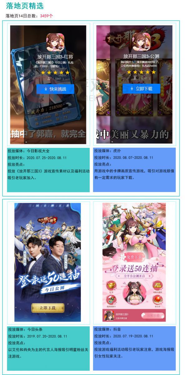 在近14天《放开那三国3》仅投放的3459个落地页里,广告宣传的内容丰富多样。不仅有运用游戏玩法做的宣传图,也有以游戏道具福利活动为亮点的落地页广告,更有具有代言人效应的下载跳转页面,意在扩宽玩家的来源渠道,吸引更多新手加入。