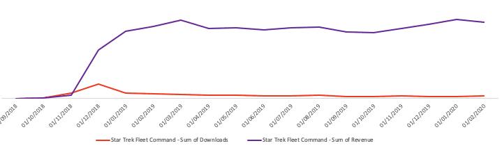 Scopely 的《星际迷航:舰队指挥官》便是一个典型例子,它既有较高的长期留存率,又有良好的长期变现能力。这点可以从波动较小的收入曲线以及安装量对收入曲线的延迟影响中看出。