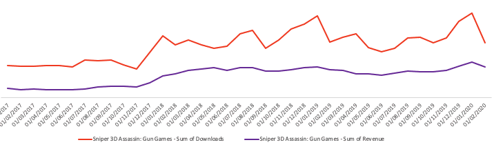 Wildlife Studios 的《Sniper 3D Assassin》与其他狙击类游戏一样,长期留存率都相对较低。这可以从安装量对收入的影响上看出来。长期留存率低的游戏必须在早期变现上下更多功夫。