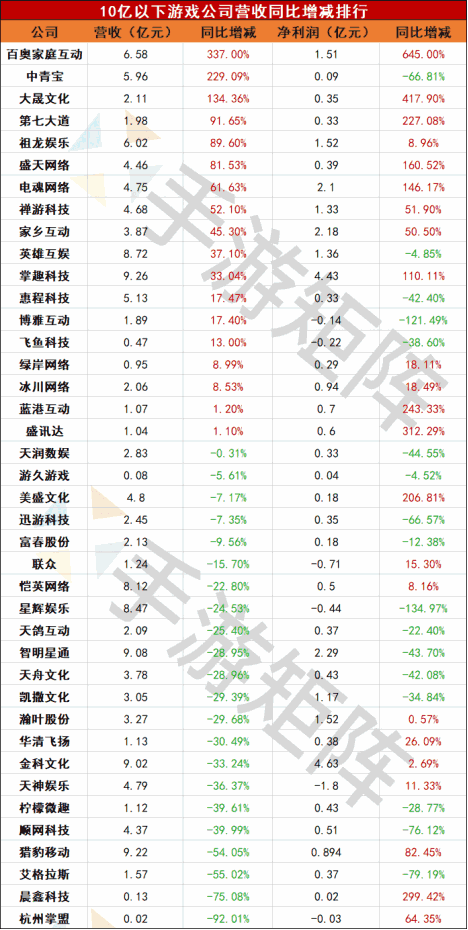 从收入10亿以下的中排开始,可以明显看到不论是在营收还是净利润上,同比增减飘绿下滑情况越来越多。在40家中排、后排的上市游戏公司财报中,有22家营收处于下滑状态,同比缩减幅度最高的是杭州掌盟,达到92%;17家净利润处于下滑状态,同比缩减幅度最高的是星辉娱乐,达到134.97%。