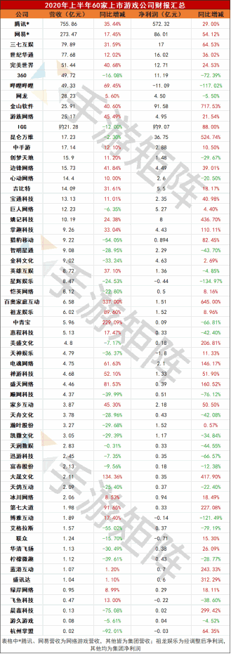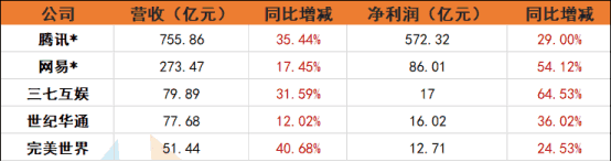 在2020 H1游戏公司财报中,腾讯、网易、三七互娱、世纪华通、完美世界是营收超过50亿的巨头。