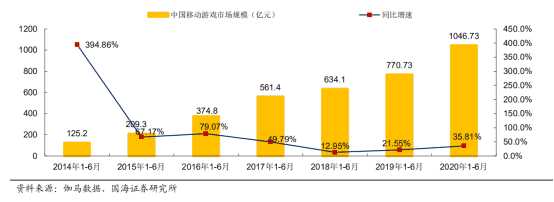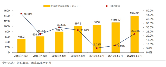根据国海证券发布的《2020 年上半年游戏市场回顾,疫情红利下的挑战与机遇?》研报来看,其中2020 H1 中国游戏市场实际销售收入达到 1394.93 亿元,同比增长 22.34%,近三年(2018 H1-2020 H1)增速首次回升至两位数,上半年移动游戏市场实际销售收入为 1046.73 亿元,同比增长 35.81%。从这点上来看,整体的市场规模继续增加,这对于行业来说是一个利好。