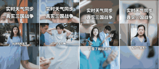 首先,这些广告都在开头模拟了一个生活化的场景:玩家和女朋友、哥们逛街,和同事上班摸鱼,亦或是母亲催促玩家帮忙做家务。在此过程中天气突变,玩家发现后下意识地打开游戏。这时,玩家周围的人会帮观众说出心中的疑惑,「这天气和打游戏有什么关系?」