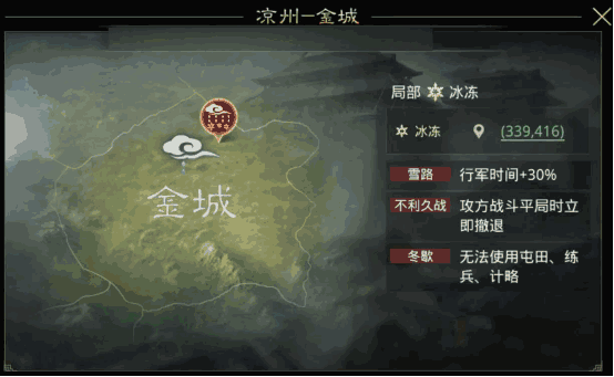 而且《率土之滨》中的天气不仅仅只是视觉效果的变化,还会对玩家的发展、用兵策略造成直接影响,比如雨天会减缓行军、拖慢建筑速度,冻雨、暴雪甚至还会影响玩家获取日常资源的效率,这意味着玩家需要考虑的战争策略更多了,也更贴近现实了。