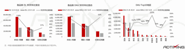 4. 从下载量来看,“休闲+网赚”的量级是“博彩+网赚”的2倍。但从DAU看,前者仅为后者的1.5倍,说明在获客效果方面,“休闲+网赚”表现欠佳。