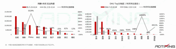 6. 美国、中国(iOS)、印度是网赚游戏流量池贡献的Top3地区。其中,美国日活玩家保持稳定增长(62%),印度实现破100%上浮,仅中国(iOS)出现38%的缩水。此外,DAU增速破100%的还有巴西(120%)和菲律宾(225%)这两个地区。