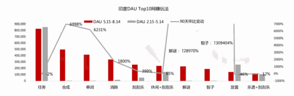 3. 近90天内,“休闲+网赚”的下载力度最大,环比增长118%,但日活玩家增速最快的却是任务式网赚(53%)。