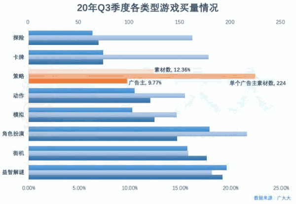 SLG产品一直都是中国厂商出海的热门品类,通过广大大平台提供的资料,2020年Q3季度累计策略广告主超过2200个,累计素材量超过500K,平均每个广告主投放素材超220个,是所有游戏类型中买量力度最大的。这类型游戏的优缺点也十分明显: