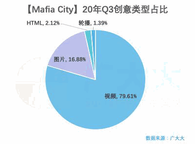 作为8月份App Store畅销榜第14名,比7月份上升一个名次,【Mafia City】可谓是友塔网络当之无愧的当家花旦。游戏从17年7月份正式发行一直到现在已经稳定运营了3年多的时间,其在很多市场亮眼的表现也是可圈可点,尤其是他独特的黑道选择向素材,在日本、俄罗斯等具有黑帮文化的国家地区很受欢迎。通过广大大平台我们也发现其在整个Q3的投放还是延续以往的特点,视频素材还是其投放的主要形式,占比接近80%。