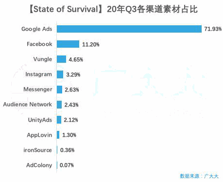 这是一款以世界末日为背景,写实风格的策略生存类手游。在这里玩家将会打造一座自己的安全基地,并且招募废土上的幸存者。在投放渠道上Google Ads使其主要的投放渠道,Q3季度该渠道素材累计超过70%,并且大部分SLG广告主都将Google Ads作为其主投渠道。