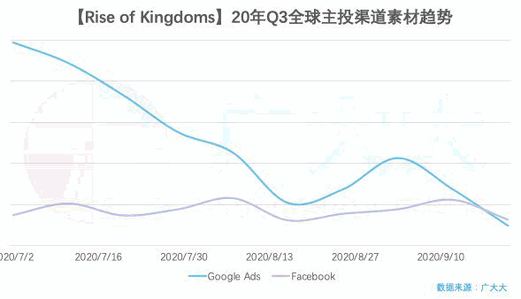 作为一款长期霸占中国出海手游营收TOP榜单,2019年出海营收第二名,仅次于【PUBG Mobile】的版权级别SLG。9月23日国服正式开放时,肯定会对国内三巨头:阿里的【三国志·战略版】、网易【率土之滨】和腾讯【乱世王者】带来不小的影响。接着来盘点下国际服整个Q3的投放趋势,Google Ads&Facebook渠道的素材量占其全球投放的素材的60%多,Google Ads是其投放力度最大的平台,在7月初的时候,单日在该渠道累计抓取到的素材在500条左右。不过在9月份可以看到莉莉丝慢慢将重心转移到了国内【万国觉醒】的上线上,单日投放的素材数量也慢慢稳定在100条左右。