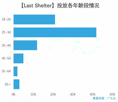 【Last Shelter】跟【State of Survival】一样都是以末世作为背景的策略生存手游,通过升级建筑,造兵,研究,打资源和采集的游戏。游戏在投放上也主要面对25-34岁的中青年的玩家,值得注意的是,其在65岁以上的“白银玩家”中也有着不错的展现。