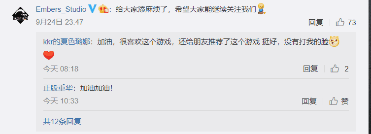与此同时,游戏制作组“Embers_Studio”也在公告的微博下面进行了道歉。