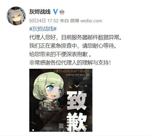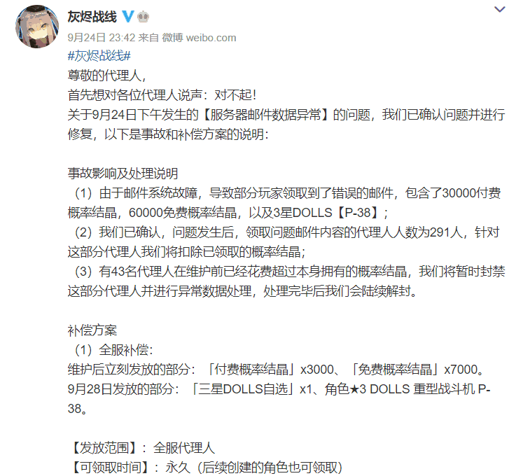 在9月24日下午,由于操作失误,二次元军武拟人手游《灰烬战线》给全体玩家发放了300连抽。但随后的处理方式让玩家集体“失忆”。