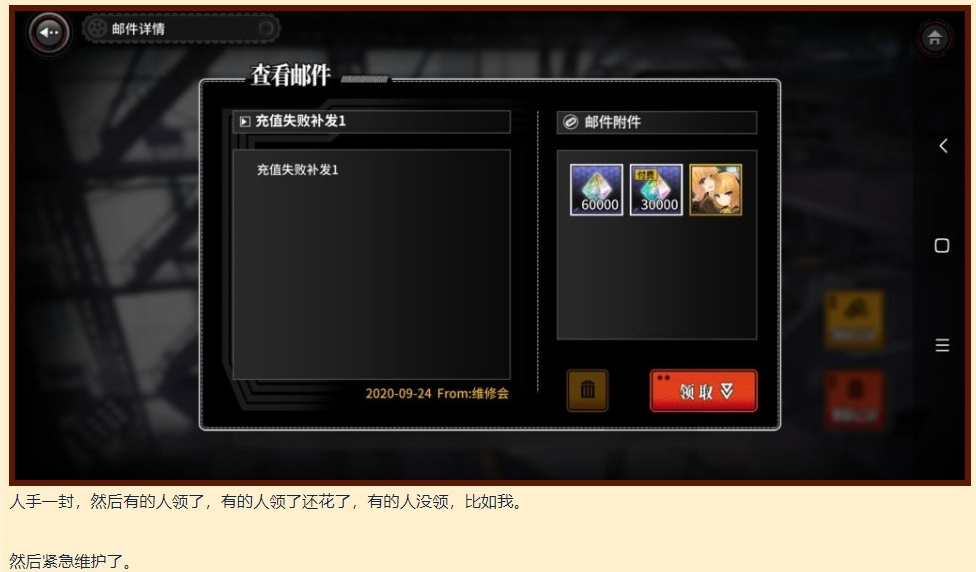 事情的经过是这样的,有玩家收到了一封包含9万概率结晶(即钻石)和一个3星角色的邮件。在《灰烬战线》中,9万概率结晶可以进行300抽,约等于4500元(人民币)。
