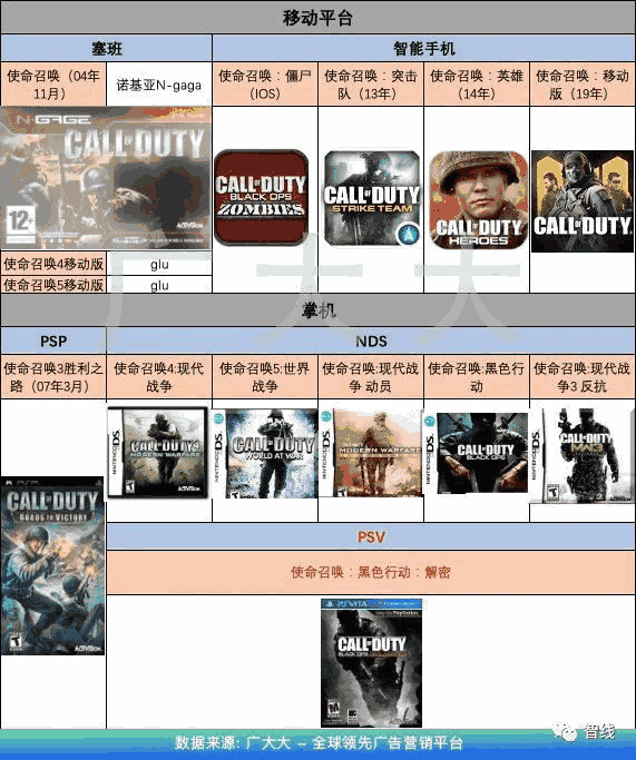 在掌机市场上,动视于2007年至2012年先后在PSP、NDS和PSV平台上发布了7款移动化使命召唤游戏。随着智能手机的横空出世和普及,再加上09年APP Store的正式开放,动视又在IOS和安卓系统上发行了一些手游比如:【使命召唤:僵尸】和【使命召唤:突击队】。