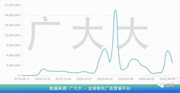 借助全球著名广告营销平台“广大大”,我们可以观察到【使命召唤:移动版】在全球的买量趋势和投放素材特点。游戏从19年10月1日正式全球公测,可以看到广告主在公测稍早的时间就开始投放素材来为游戏造势,之后一直到20年2月中旬,游戏买量的力度都相对的平缓。不过从端游【使命召唤:战区】将吃鸡这一热门玩法引入到这个经典IP,再到移动版吃鸡模式的上线,整个20年Q2季度【使命召唤:移动版】的买量力度呈现指数形上涨,“广大大”平台单日抓取到的素材去重后就接近2000条。大量的曝光也为游戏吸引到了足够高的关注度。