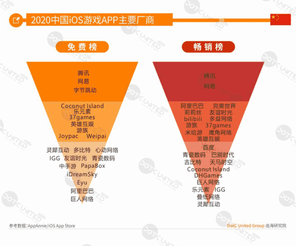 统计中国游戏iOS APP Store TOP200显示,不论免费榜或畅销榜,腾讯和网易依然稳居龙头地位。字节跳动凭借旗下《我功夫特牛》《皮皮虾传奇》《暴力飞车》等多款游戏在国内的游戏研发和发行领域不断斩获席位。此外,椰岛游戏、乐元素、37games、英雄互娱、阿里巴巴、完美世界、莉莉丝和友谊时光等厂商也都是中国游戏市场的中流砥柱。