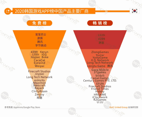 统计韩国游戏iOS & Google Play Store TOP200显示,免费榜上中国厂商有宝宝巴士、游族、腾讯和字节跳动等厂商,畅销榜上主要的中国厂商有莉莉丝、4399、游族等公司。莉莉丝旗下2款游戏《万国觉醒》和《AFK Arena》双双跻身韩国游戏APP畅销榜TOP5,可谓目前在韩国市场上最赚钱的中国游戏公司。