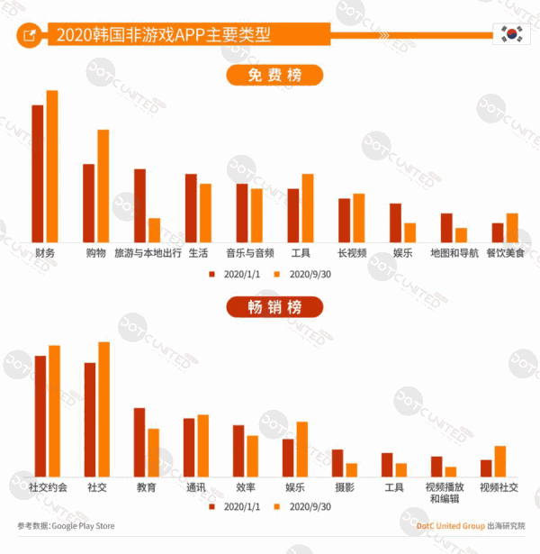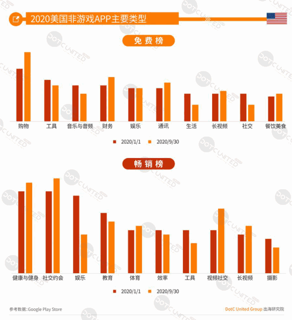统计美国非游戏APP Google Play Store TOP200显示,免费榜主要有购物、工具、音乐音频和财务等类型。美国市场上的购物类产品90%来自本土,主流应用包括Walmart、Amazon、Wish等。中国购物应用Alibaba和SHEIN在美国也有较好成绩。