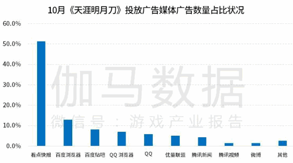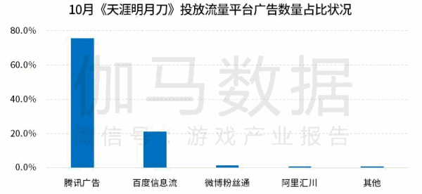 《天涯明月刀》上线首月在10家流量平台进行了广告投放,广告媒体达到20家。在该款游戏的广告投放分布上,其中腾讯广告平台数量占比超过75.8%,百度信息流平台占比超过21.2%。看点快报和百度浏览器这两家媒体广告投放数量合计占比超6成。