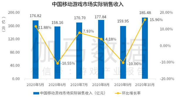 伽马数据《2020年10月移动游戏报告》(公众号:游戏产业报告)显示:2020年10月,中国移动游戏市场实际销售收入185.48亿元。和上月比,移动游戏市场环比增长15.96%。