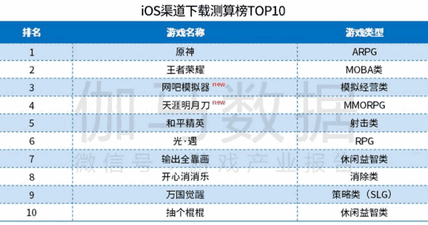 2020年10月,进入iOS下载测算榜TOP10中,《原神》登顶,iOS免费榜至今仍保持在TOP10以内。模拟经营类移动游戏《网吧模拟器》国庆期间连续5天登顶iOS免费榜,通过“经营网吧”吸引用户,同时各种梗给用户带来乐趣。