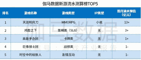 新游流水测算榜TOP5中,仅一款IP改编产品。《天涯明月刀》为古龙正版授权,端游核心团队打造的武侠题材MMORPG移动游戏,上线第二天便登顶iOS畅销榜,并连续霸榜三天,成为腾讯的又一爆款产品。经典武侠IP改编和端转手带来大量用户,同时产品也进行了一定量的广告投放获取用户,而高品质画质及成熟玩法成为留存用户的主要因素,伽马数据预测首月流水将超过13亿元。