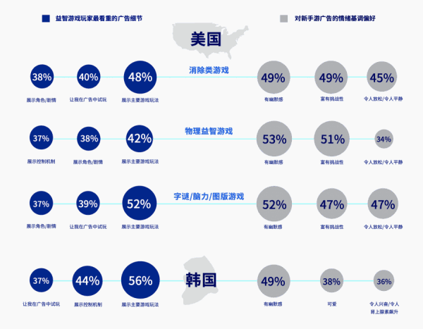 益智游戏玩家还特别喜欢试玩广告 (Playable Ad),40% 的美国玩家和 37% 的韩国玩家希望能够直接通过广告试玩游戏。