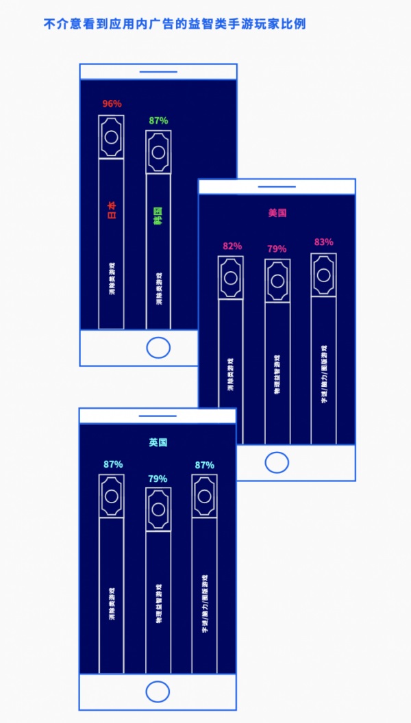 益智游戏玩家理解并能够接受应用内广告代表的价值交换,80% 的美国玩家和 96% 的日本玩家表示不介意在游戏中看到应用内广告。但在利用应用内广告进行变现时,必须要考虑玩家的偏好。一般来说,相较于单次时间短但次数多的广告展示,益智游戏玩家更喜欢单次时间较长但次数相对少的广告展示方式。超过半数的英国益智游戏玩家和 49% 的日本玩家表示,在 10 分钟的游戏过程中,他们更愿意看到一次 30 秒钟的广告,而不是多次看到时间更短的广告。用奖励手段激励玩家看广告也许同样有效:59% 的韩国消除类游戏玩家表示,在能获得奖励时,他们更愿意观看应用内广告。
