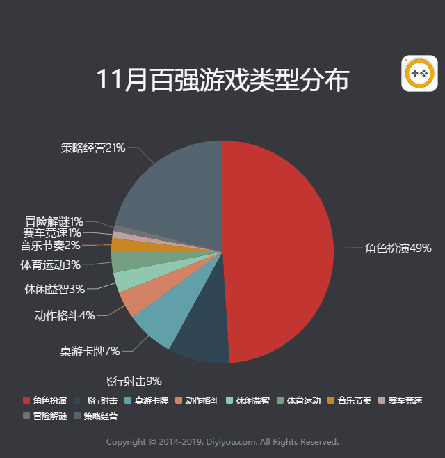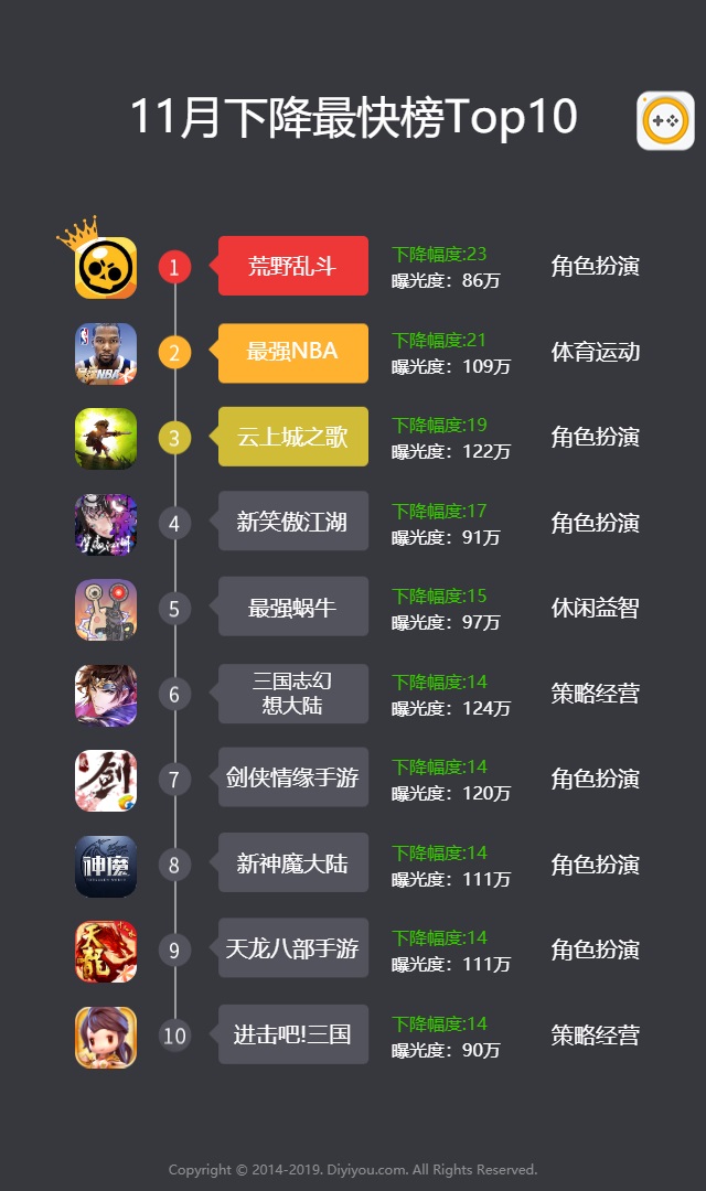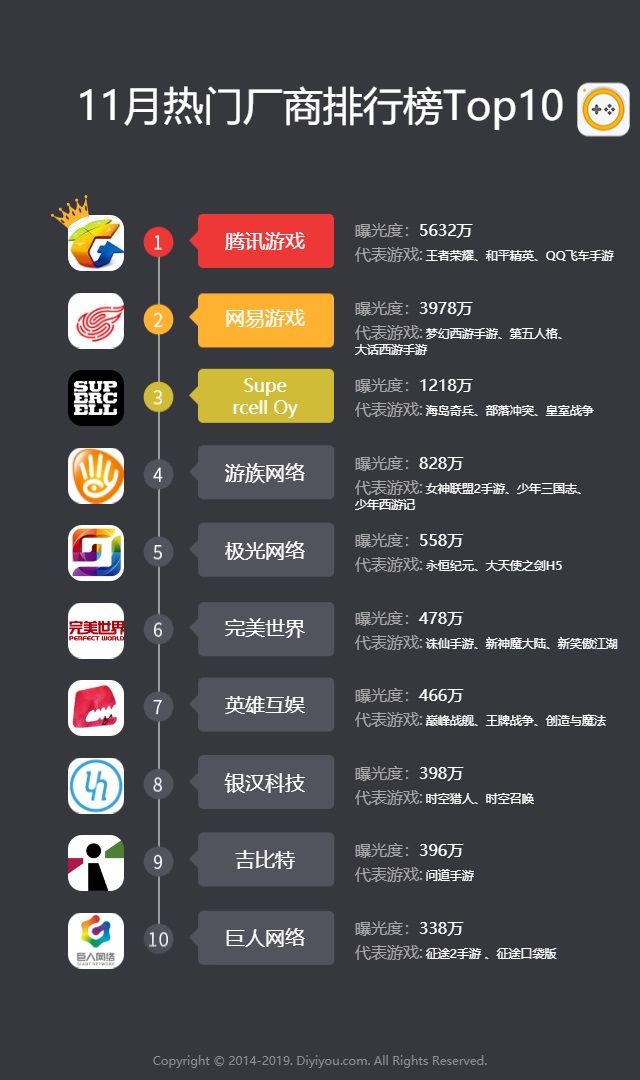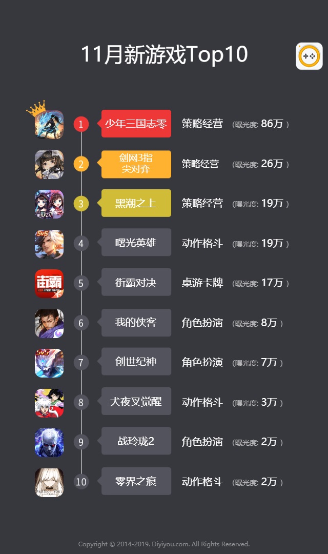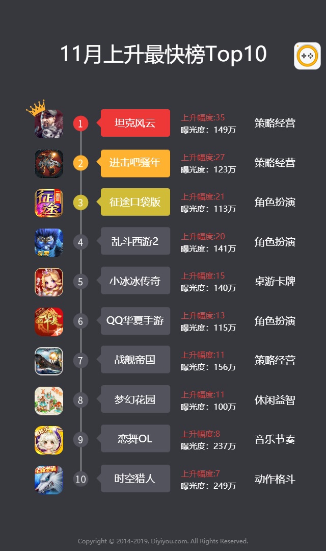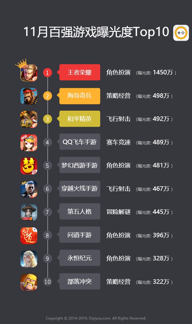 二、11月份百强手游曝光度Top 10与百强游戏类型分布