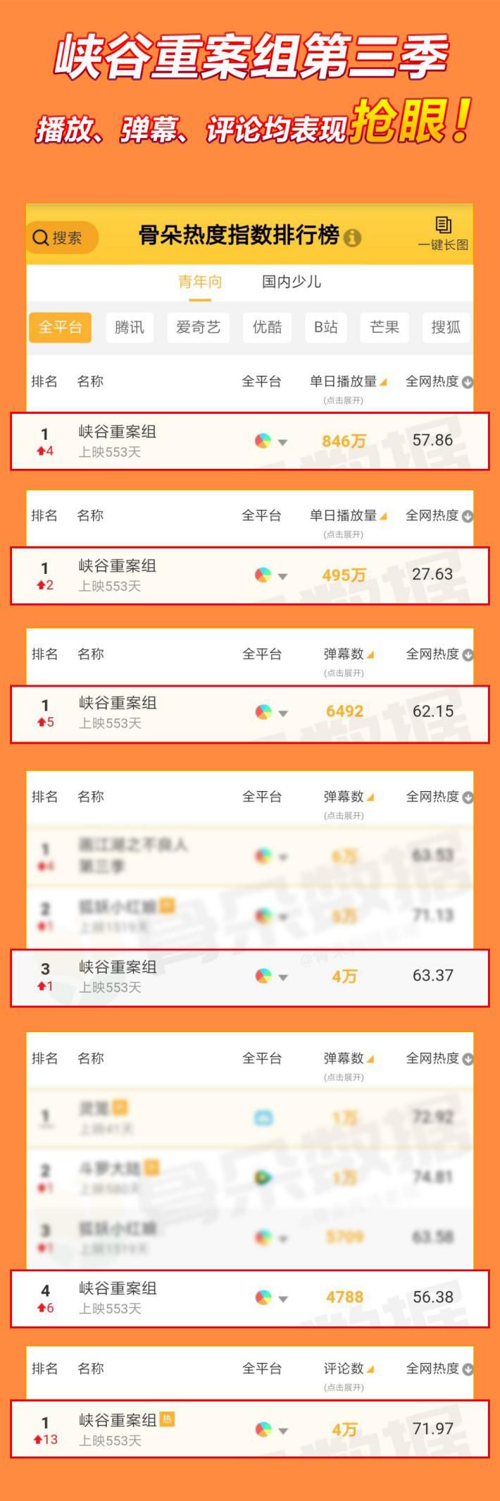 前两季受到市场的一致好评,刚刚完结的第三季《峡谷重案组》成绩则更加突出,播放热度榜单和弹幕评论榜单上都有不错的表现。