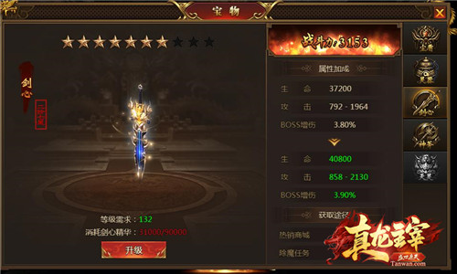 到达130级开启宝物剑心,剑心的主要作用是提供主角生命,而获得的方式是商城传奇币购买跟每天的除魔任务获得。