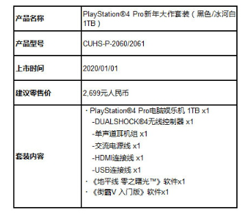 今天(12月27日)PlayStation 中国官方宣布,PS4 Pro 国行【新年大作套装】将于2020年元旦正式发售。据悉本套装除了包含 PS4 Pro 1TB 主机外,还有《地平线:零之曙光》标准版实体碟以及《街霸 V:入门版》实体碟共计两款游戏,建议零售价2699元人民币。