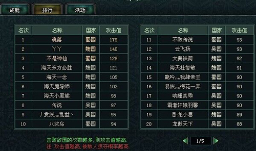 攻击敌国玩家是获得威望的最重要途径,威望决定您的官职和俸禄。威望越高,能获得威望武将和威望福利也越多。因此要想加官进爵,就速度集结部队讨伐敌国吧。《卧龙吟》对玩家攻伐有个独立的攻击值系统。每攻击并战胜对方国家城池的玩家对该国家积累1点攻击值。每个玩家针对每一个敌方国家都具有一个攻击值。攻击值的高低决定了当前敌国玩家所能看到的状态情况。积累值不清空,积累值会随着被对方国家玩家攻击打败而降低。被打败1次降低1点攻击值。
