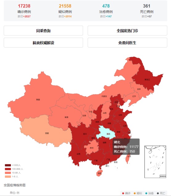 在2020年春节即将到来之际,一场席卷全国乃至全球的疫情悄然降临,截止到2月3日10点已有17238人确诊、21558人疑似、造成361人死亡,治愈478人。
