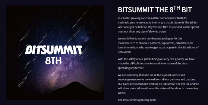 早些时候,原定于今年2月6日举办的中国台湾台北电玩展就因疫情而宣布延期到今年得到6月25日举办。原定于5月9、10日在日本东京举办的大型独立游戏展会BITSUMMIT 8th也于今日宣布取消。